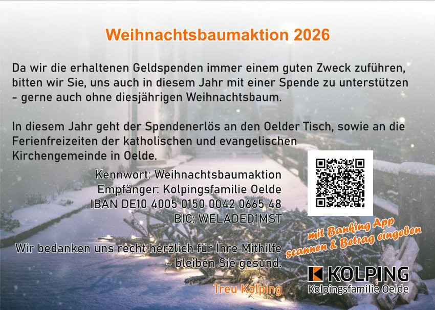 Die Kolpingsfamilie Oelde wünscht allen Mitgliedern, Freunden und Bekannten ein frohes, friedliches und gesundes Jahr 2026.